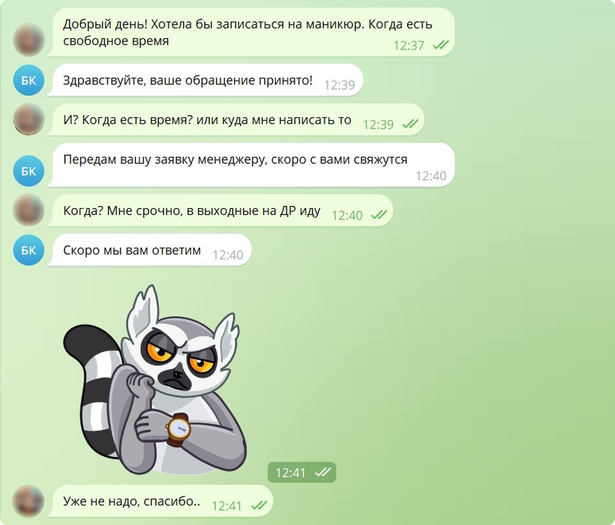 3.Нет конкретики и персонализации. Боты дают шаблонные ответы: «с вами свяжется менеджер», «обращение принято». Клиенты не понимают, сколько ждать и когда решат их вопрос.