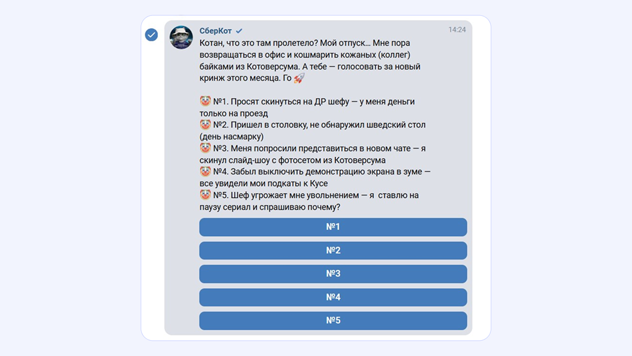 Также в боте можно выбрать кринж месяца. За участие в голосовании СберКот дарит стикеры.