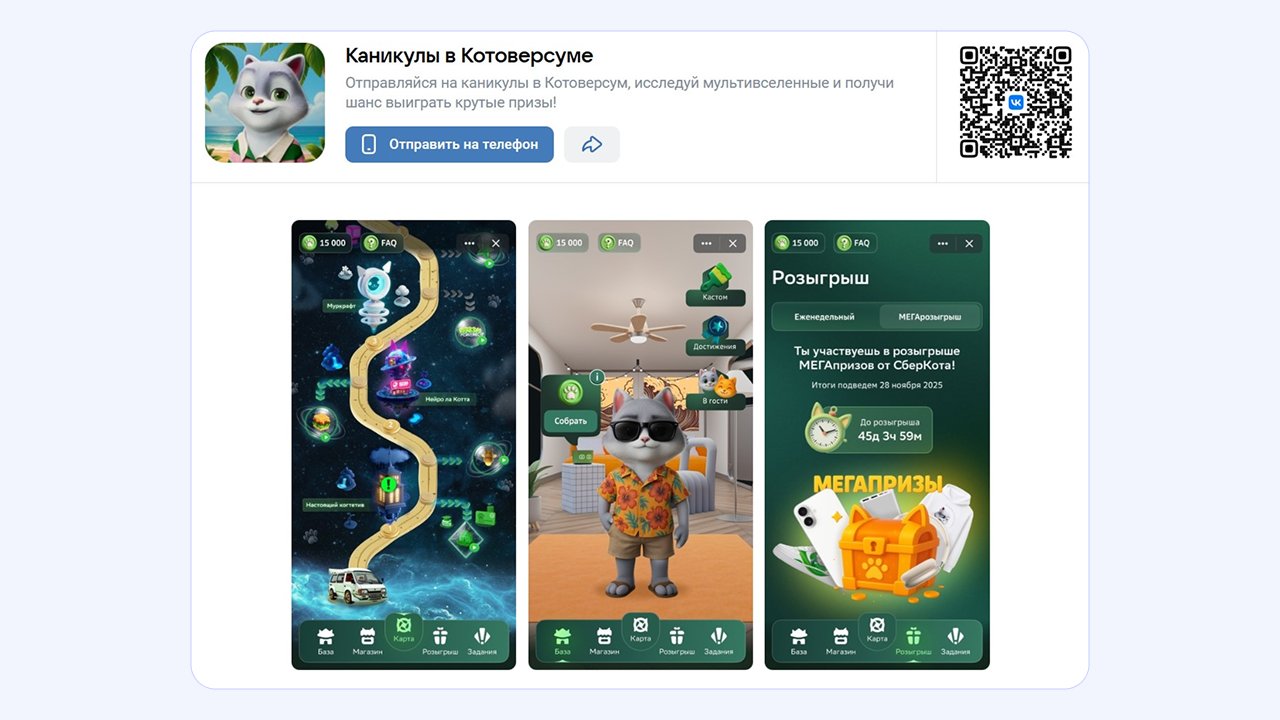 Для более сложных и долгих сценариев банк использует геймификацию в приложении. Например, «Каникулы в Котоверсуме» — это игра-мультивселенная для знакомства с финансовыми продуктами банка.