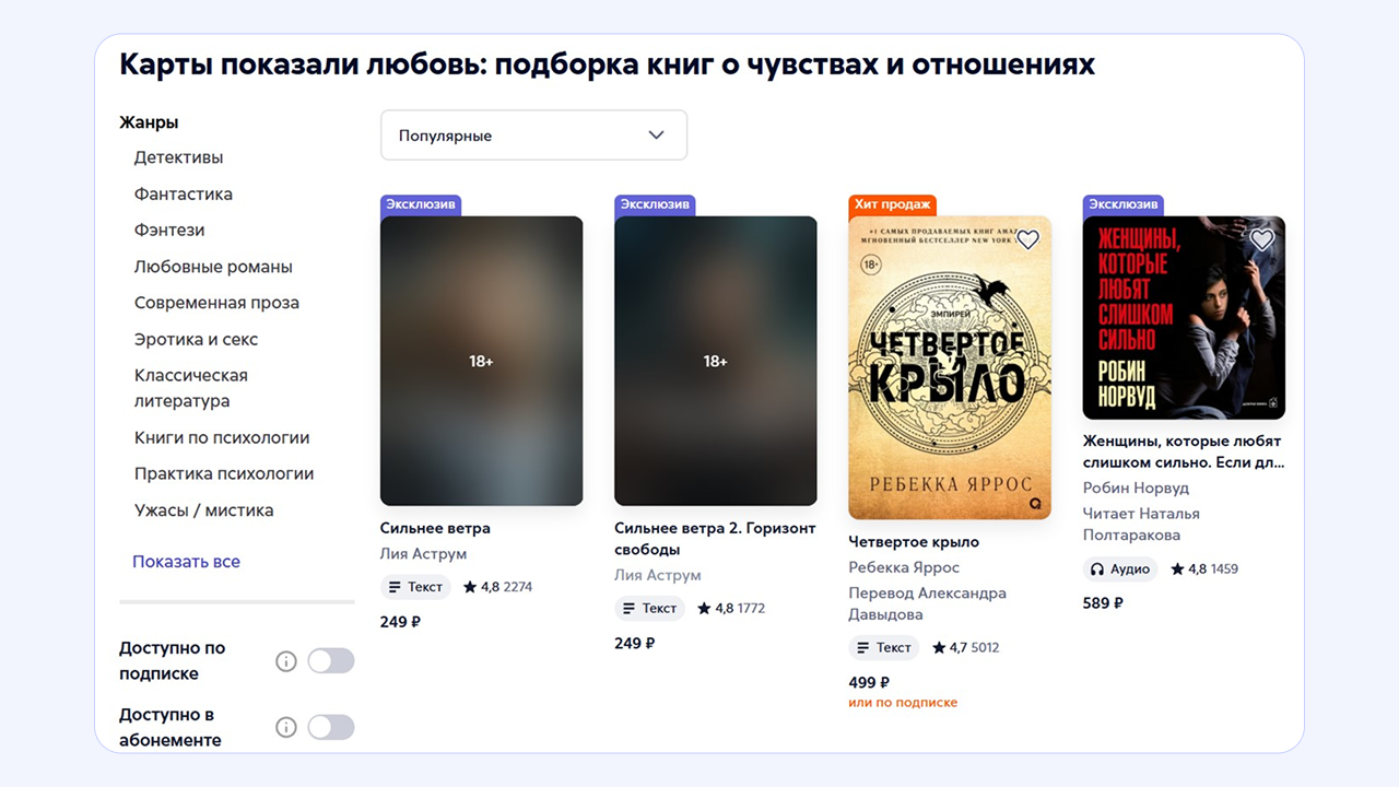 После выбора карты пользователь переходит на сайт и видит подборку книг на определённую тему. С помощью геймификации в email-рассылках интернет-магазин повышает вовлечённость, увеличивает переходы на сайт и продажи.
