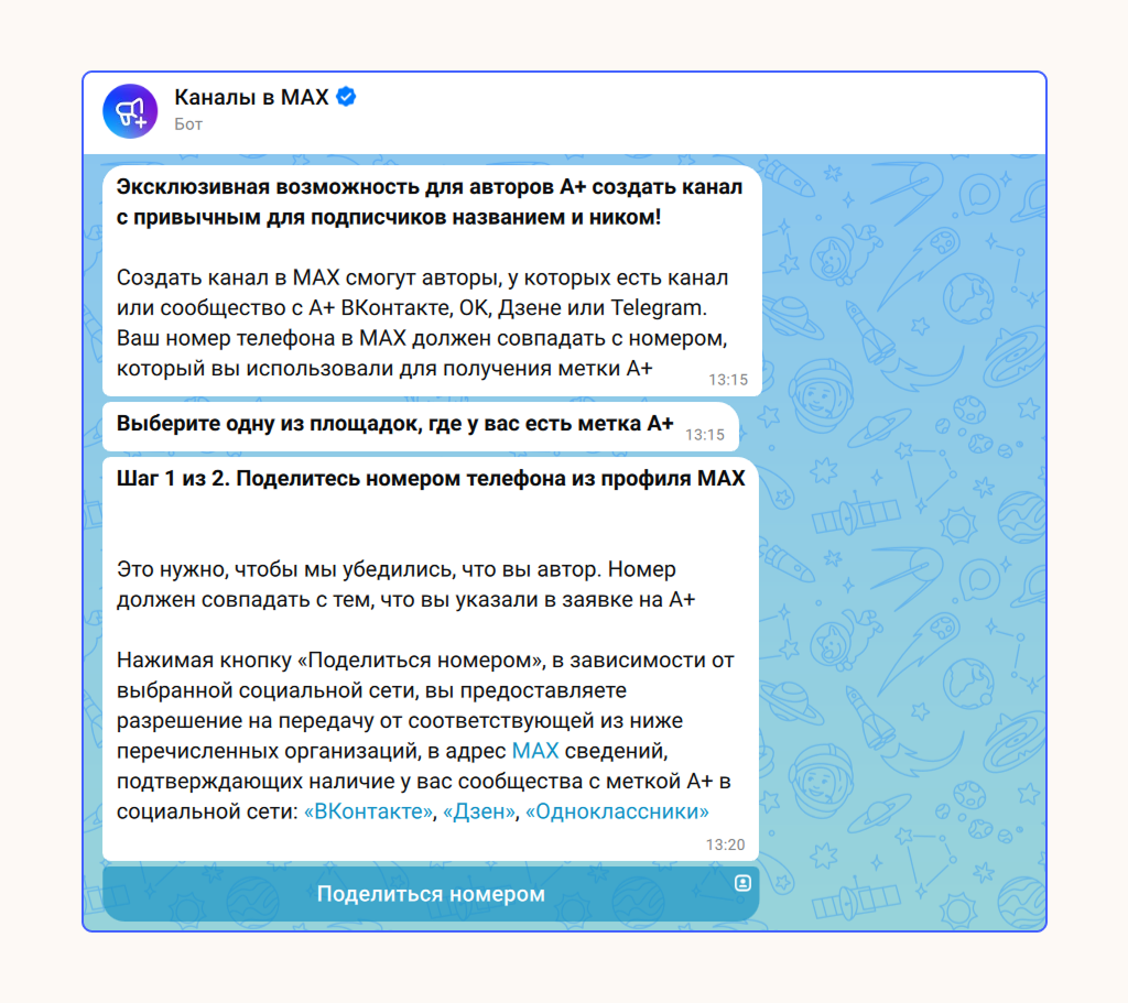 Каналы авторов с отметкой «А+» получают ник, который был на другой площадке, например, ВКонтакте. Для новых каналов в мессенджере MAX ссылка генерируется автоматически по шаблону idИНН_biz.
