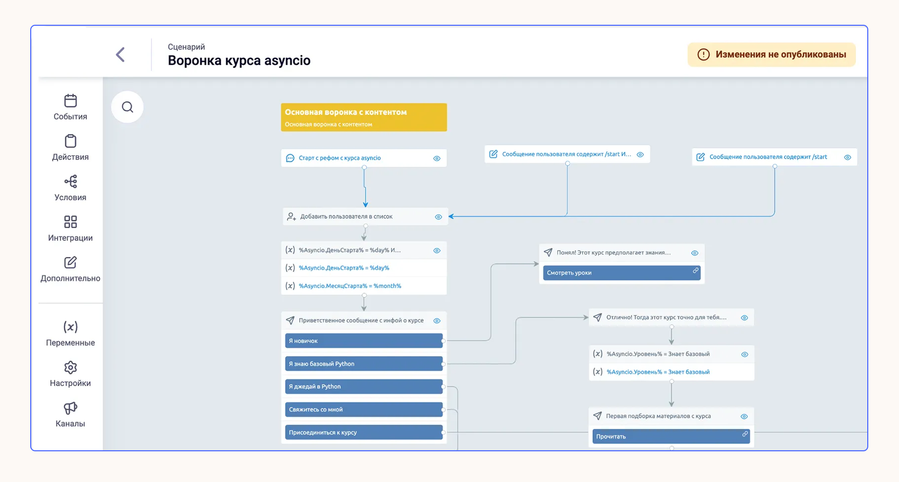 - создавать сценарии чат-ботов на конструкторе и подключать их к любому количеству каналов;