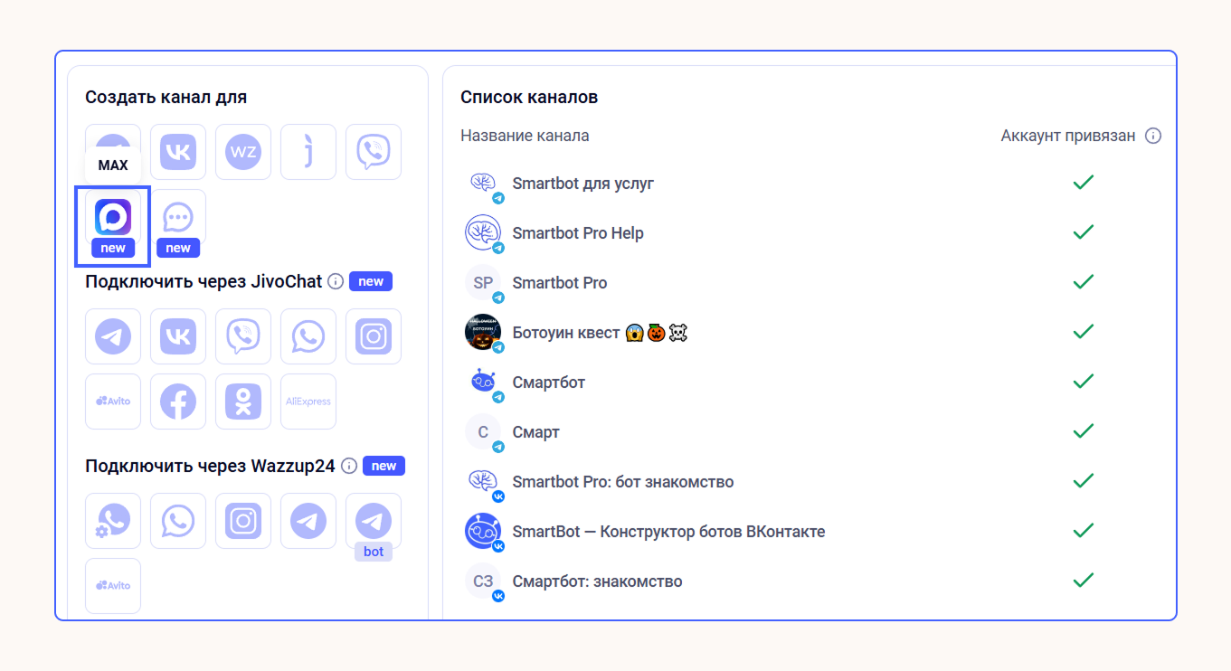 В главном меню Smartbot Pro выберите Каналы → MAX.