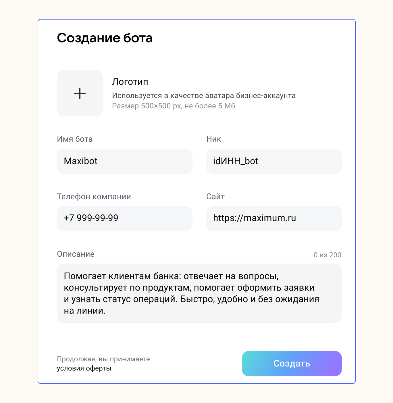 В разделе «Чат-боты» нажмите «Создать» и внесите данные в карточку: