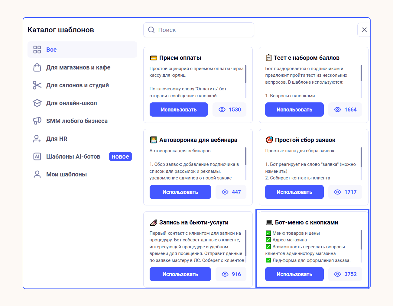 1. Выберите шаблон. Из главного меню конструктора перейдите в Сценарии → Использовать шаблон → Бот меню с кнопками.