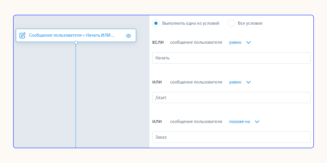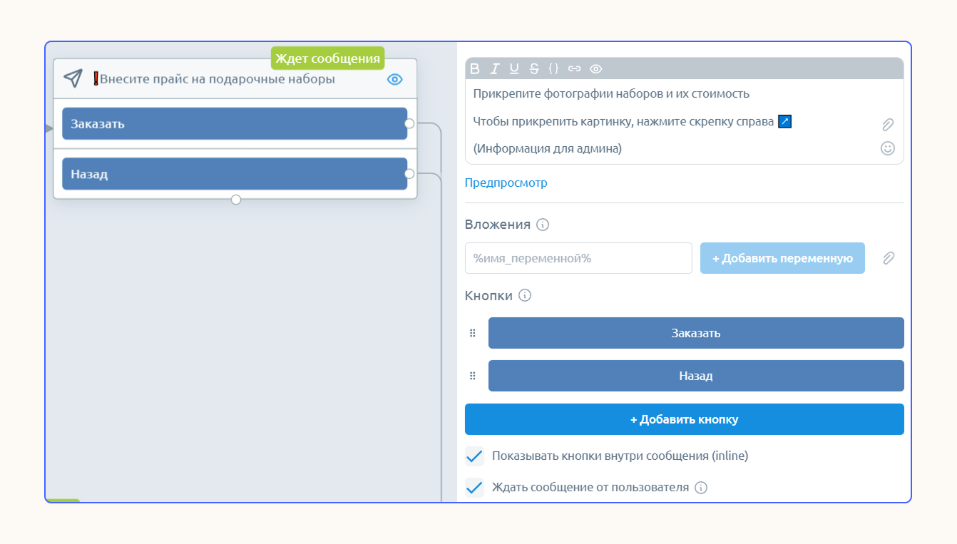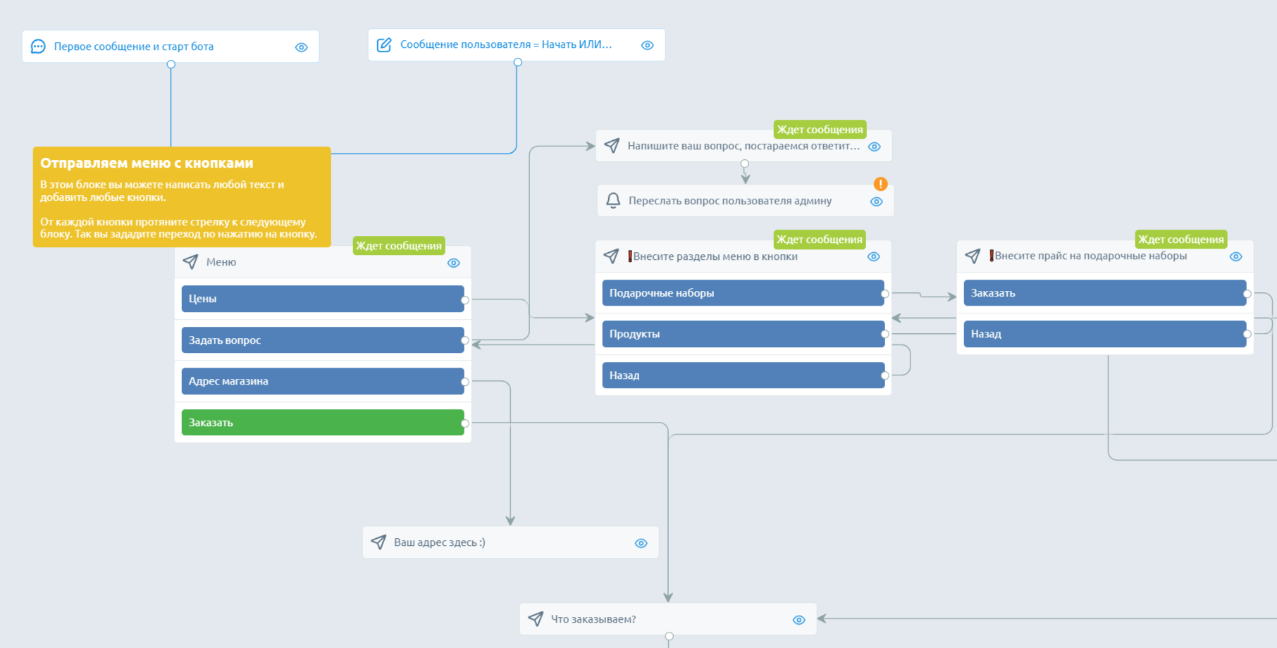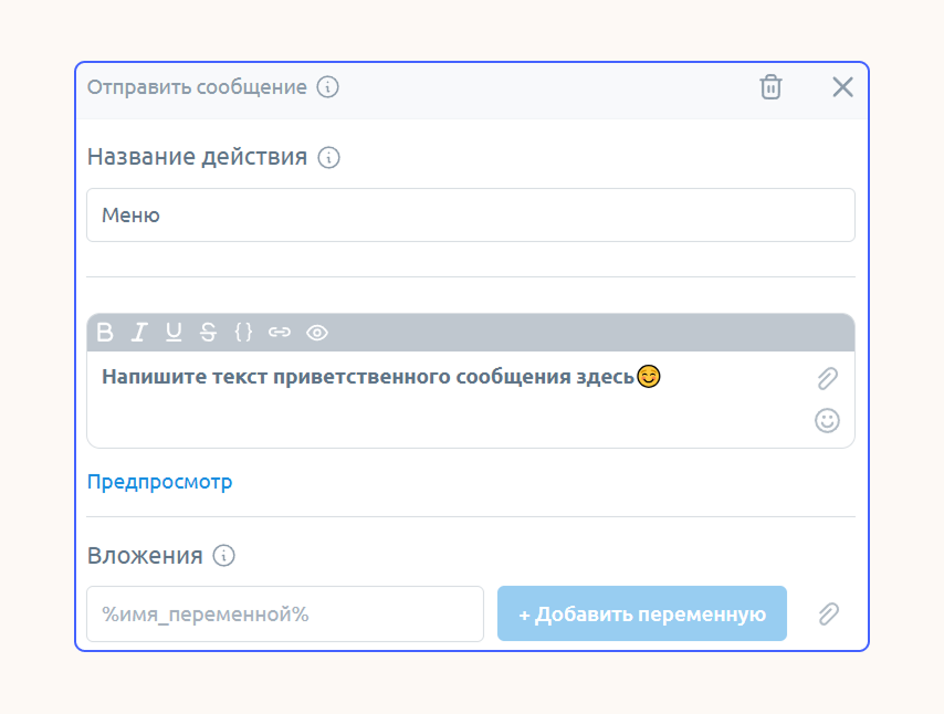Напишите первое сообщение: внесите свой текст в настройках блока с меню. Например, поприветствуйте пользователя и расскажите о функциях бота.