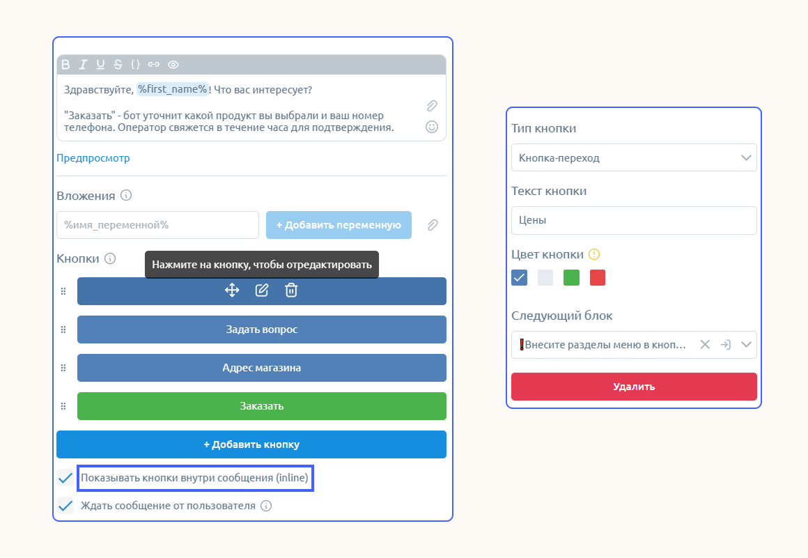 Кликните на кнопку, нажмите на значок редактирования и заполните карточку. Чат-боты в мессенджере MAX поддерживают только inline-кнопки. Чтобы они отображались в сообщении, поставьте галочку в соответствующем поле.