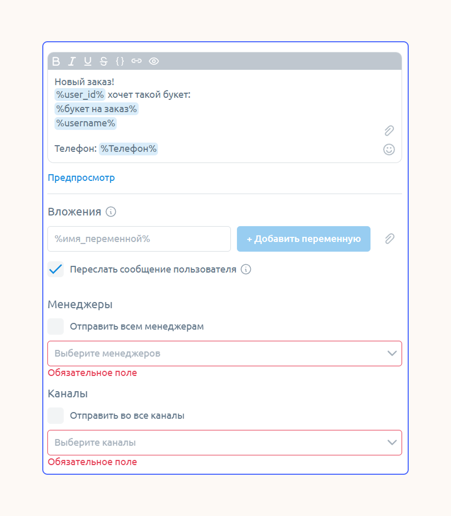 Замените контент в блоках, выберите менеджеров и канал для отправки уведомлений.