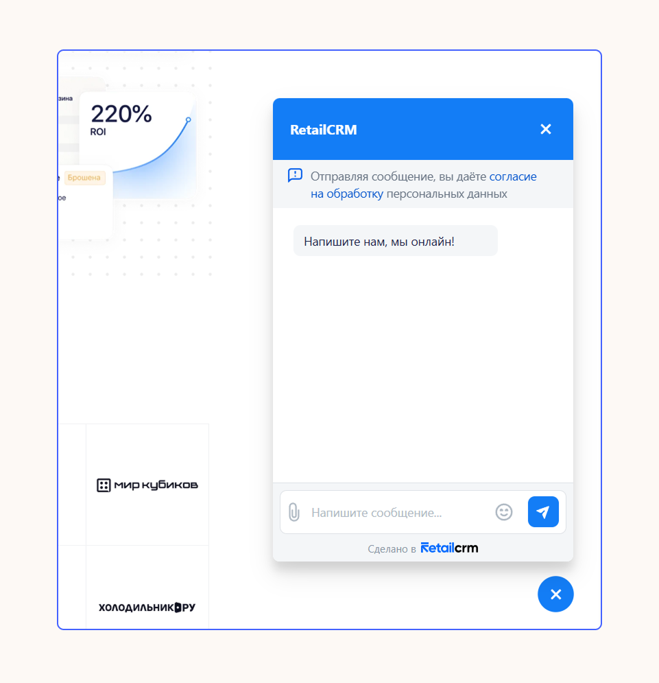 2. Чтобы установить онлайн-чат на сайт, не нужны навыки программирования. Готовое решение Smartbot Pro позволяет создать виджет за 10 минут. Можно выбрать дизайн, настроить положение на странице и добавить форму сбора контактов в соответствии с 152-ФЗ.