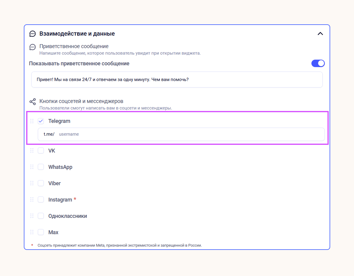 Соцсети и мессенджеры. Проставьте чекбокс у нужных каналов связи и вставьте ссылку. Так пользователь сможет выбрать удобный способ коммуникации.