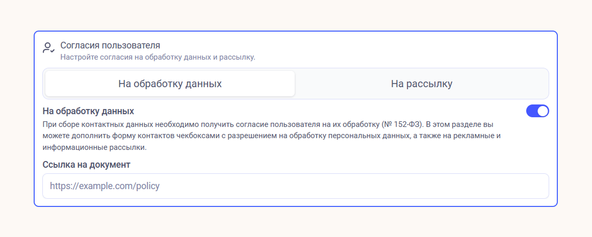 Согласия. В соответствии с 152-ФЗ нужно получить разрешение пользователя на обработку персональных данных. Вы можете добавить такое поле в форму сбора контактов в онлайн-чате.