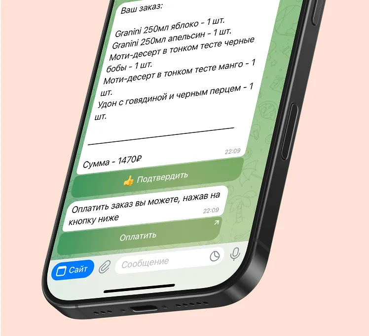 Сокращайте путь клиента и увеличивайте конверсию: пользователи оформляют заказы в привычном интерфейсе Telegram-магазина без переходов на сайт.